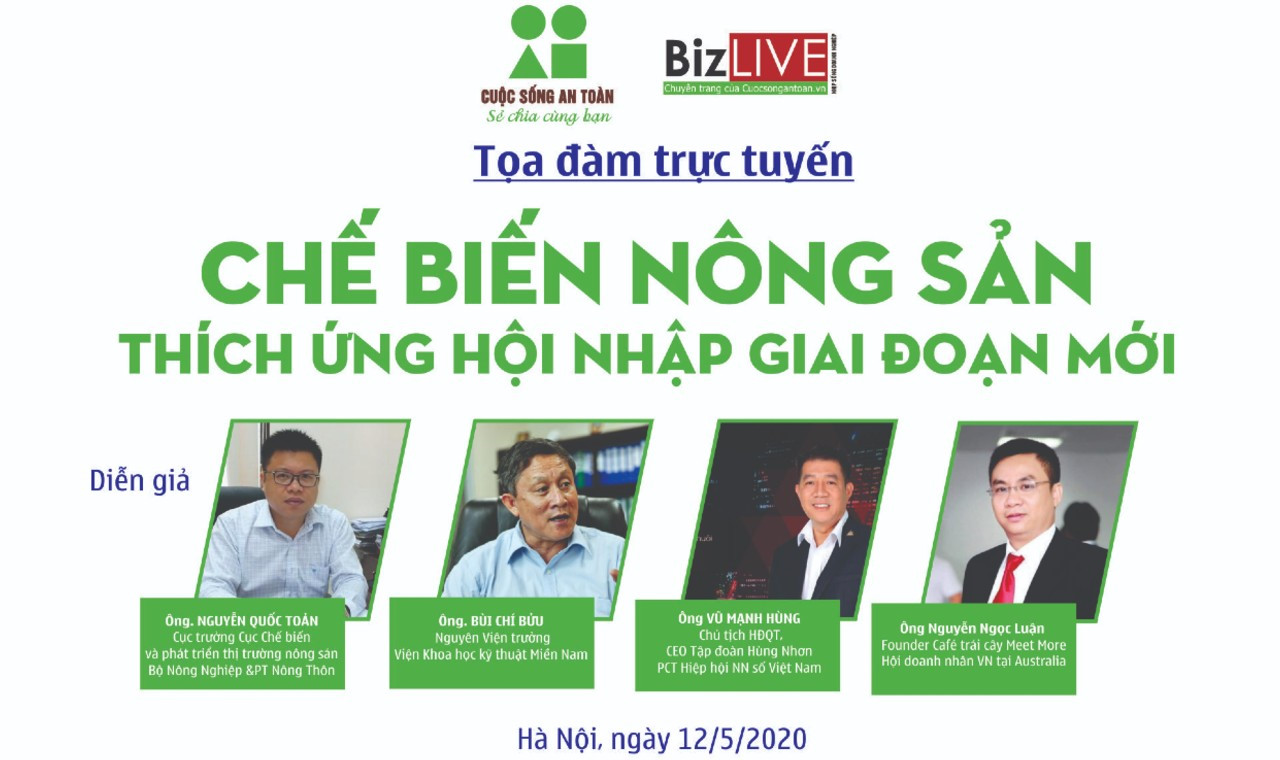Sáng 12/5, BizLIVE đã tổ chức Toạ đàm trực tuyến “Chế biến nông sản thích ứng hội nhập giai đoạn mới” với sự tham gia của ông Nguyễn Quốc Toản, Cục trưởng Cục Chế biến và phát triển thị trường nông sản, Bộ Nông nghiệp và Phát triển Nông thôn; GS. TS Bùi Chí Bửu, Nguyên Viện trưởng Viện Khoa học Kỹ thuật Miền Nam; Ông Vũ Mạnh Hùng, Chủ tịch HĐQT, CEO Tập đoàn Hùng Nhơn, Phó Chủ tịch Hiệp hội Nông nghiệp số Việt Nam; Ông Nguyễn Ngọc Luận, Founder thương hiệu Café trái cây Meet More, Phó chủ tịch Hội doanh nhân Việt Nam tại Australia.